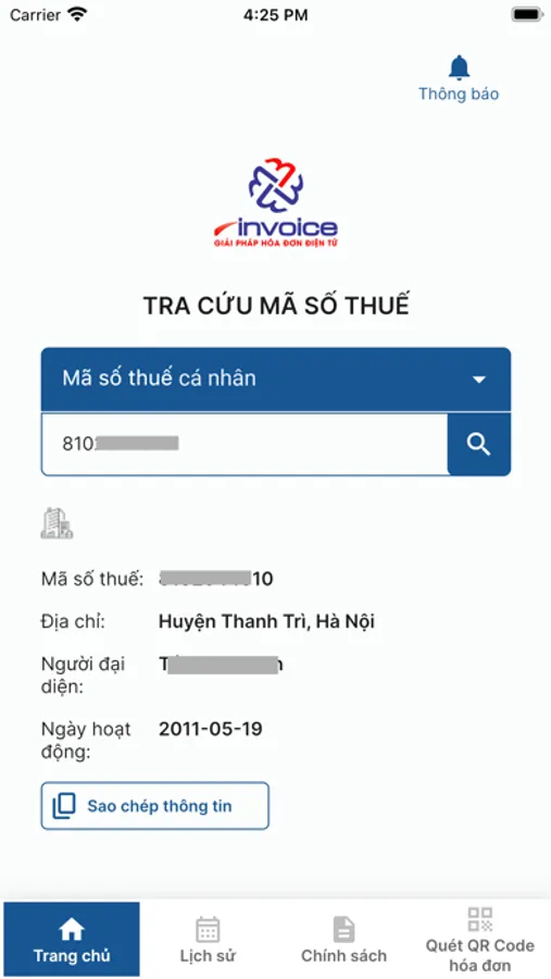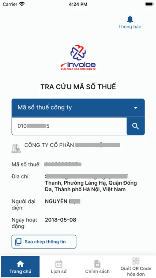 Ứng dụng được tích hợp sử dụng giữa tra cứu mã số thuế và tra cứu hóa đơn, với một số tính năng tra cứu như sau: