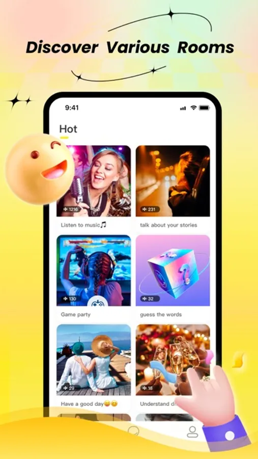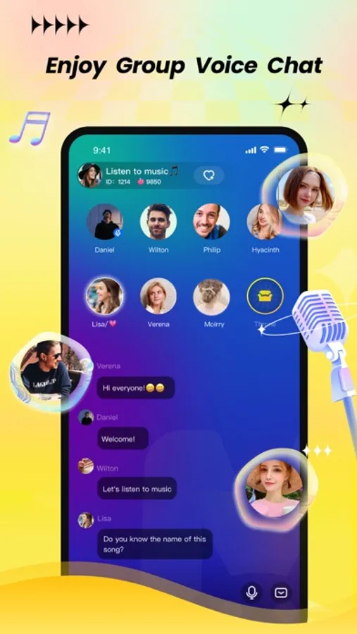 You can discover various voice chat rooms of different topics, find the rooms you are interested in and have a voice chat party with up to 9 friends.