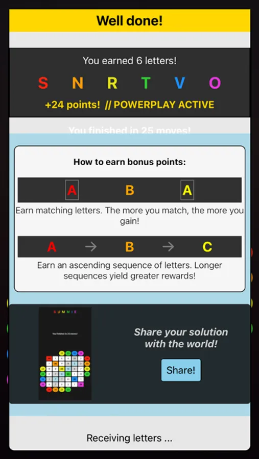 Each week, Summie users race against time to accumulate a certain number of points. Users solve puzzles to gain letters, piece together the letters to form words, and then submit the words to earn points! You are also rewarded for earning particular pairs and sequences of letters, adding an element of luck to the game that ensures the weekly deadline is always within reach!