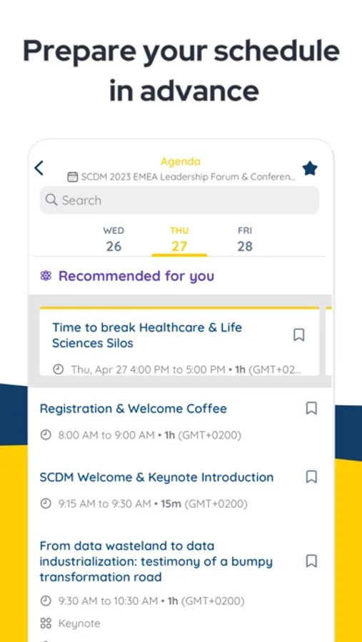 Bookmark your favourite sessions and interact with your peers directly in the app. The app will keep you up to date with upcoming sessions and important events taking place during the conference.