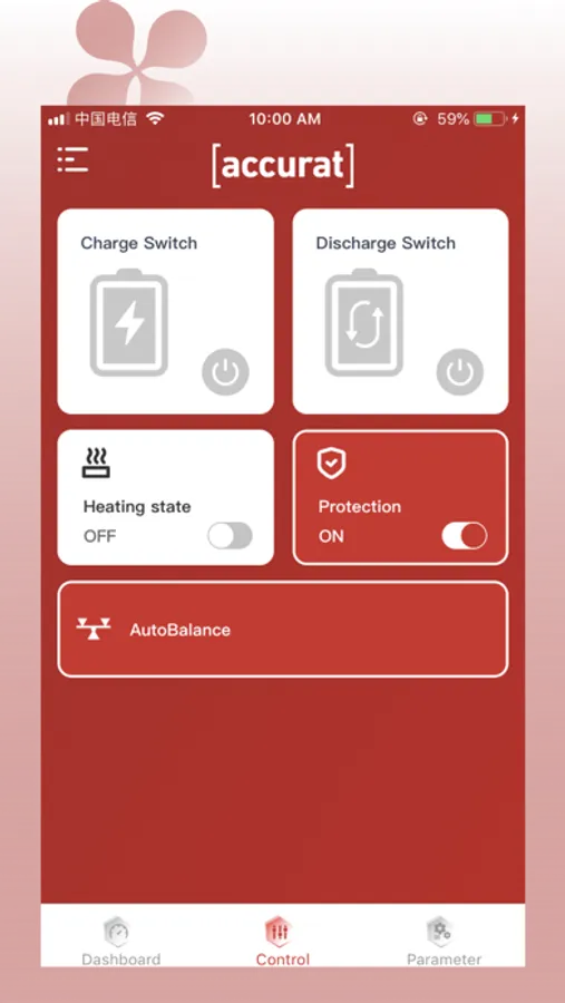 3) Provides interactive functions on the "Control" tab including: Charge Switch, Discharge Switch, Heating state, Protection and AutoBalance .