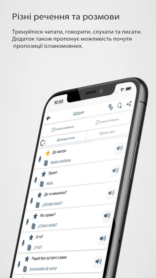 Перевірте свої знання за допомогою різних типів тестів, які пропонує додаток, наприклад: комбінування слів з однаковим значенням, пошук правильної відповіді на зображенні, переклад слова чи речення, прослуховування речення, а потім написання його, промовляння речення, яке з'являється та ін.
