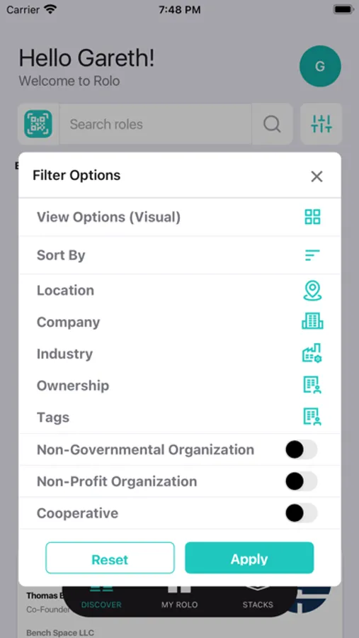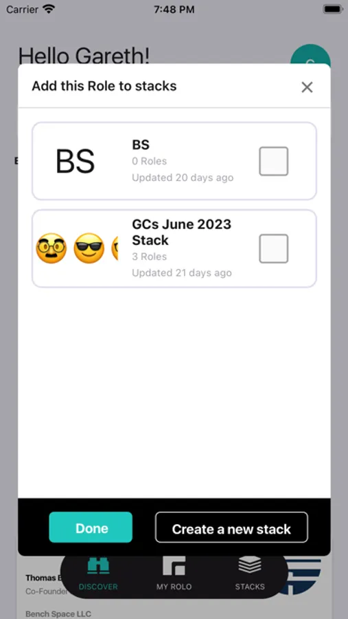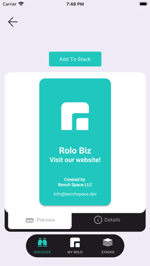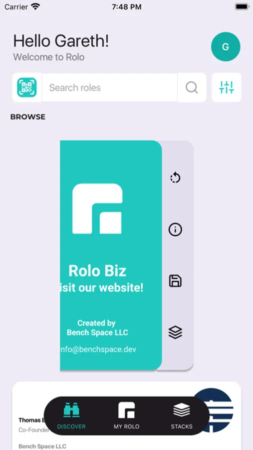 Create and design your Role or Roles in Rolo Biz's dashboard at app.rolo.biz. Share your Roles, receive Roles from other users, and organize Roles into Stacks. Use Stack Sharing to share a collection of multiple users' Roles at once.