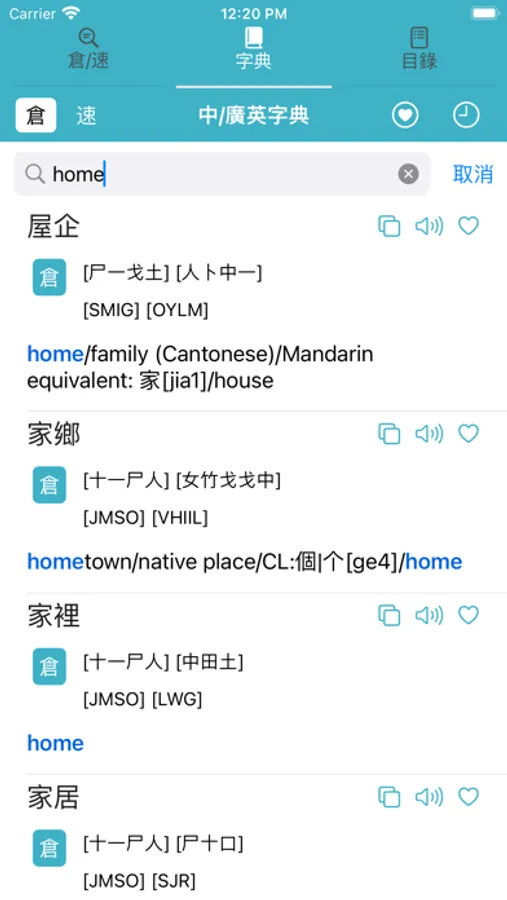 - 中文/廣東話英文字典:本app內置了完整的中文英文字典和廣東話英文字典,使用者輸入可以英文來查詢漢字或廣東話以及其倉頡碼和速成碼。本字典還提供了讀音和詞語解釋,方便使用者進行查詢和學習。