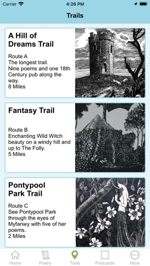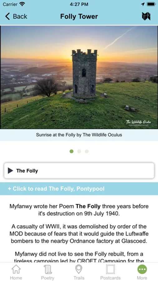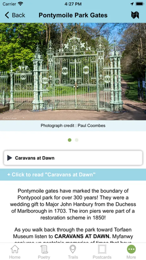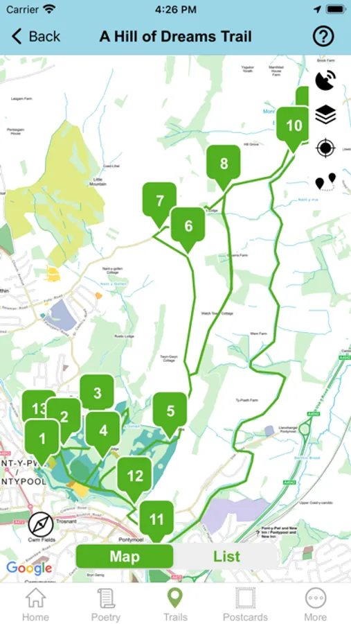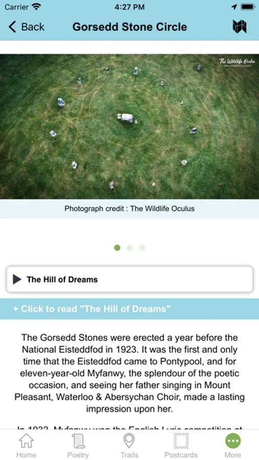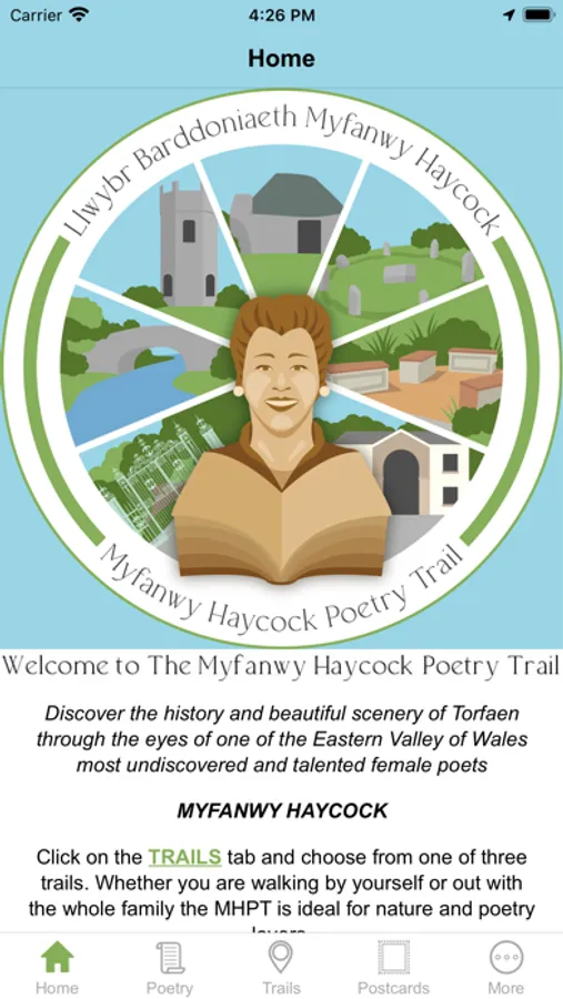 - Audio - At certain points GPS will trigger relevant Poems (9 in total), some of which are exclusively recited by Myfanwy, from recordings she made before she passed away.