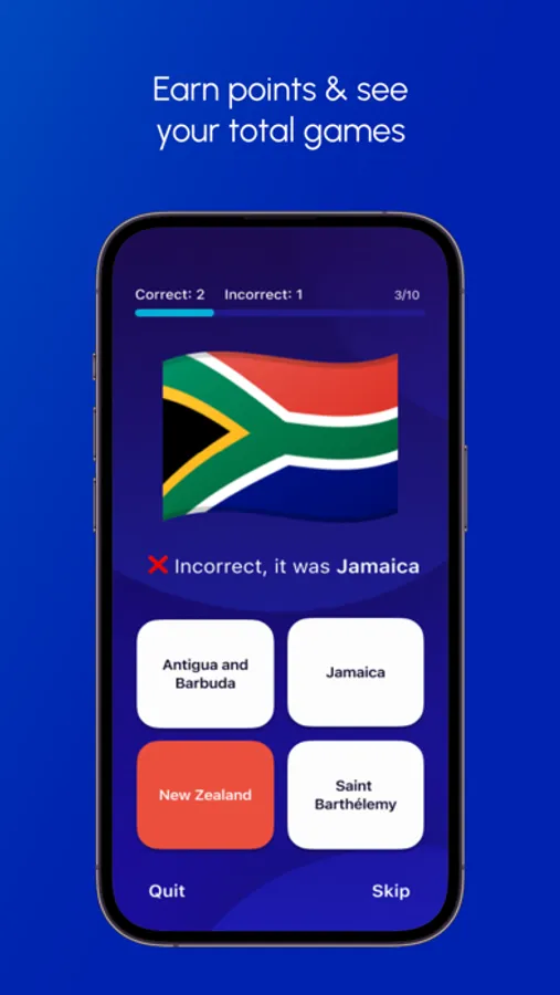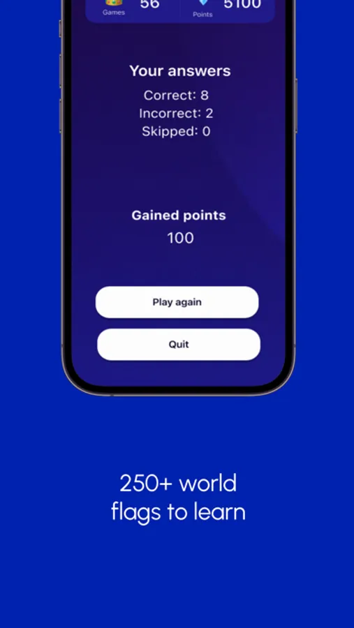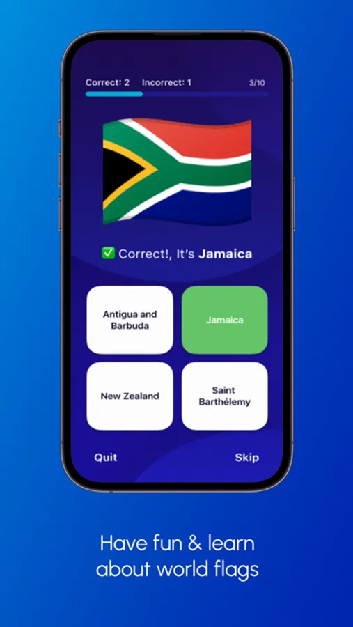 Test your knowledge about national flags with this fun game! Identify flags by tapping the correct country name from four options. Track your progress with a real-time progress bar and beat your personal best by guessing ten flags from around the world. Your final score is saved and added to your overall score.