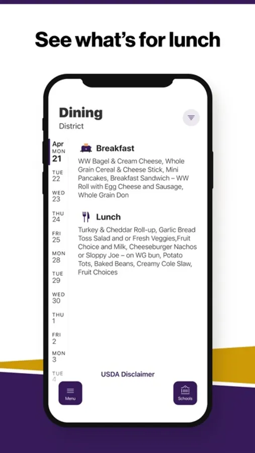 Within the dining section, you'll find an easy to navigate, weekly menu, sorted by day and meal type.