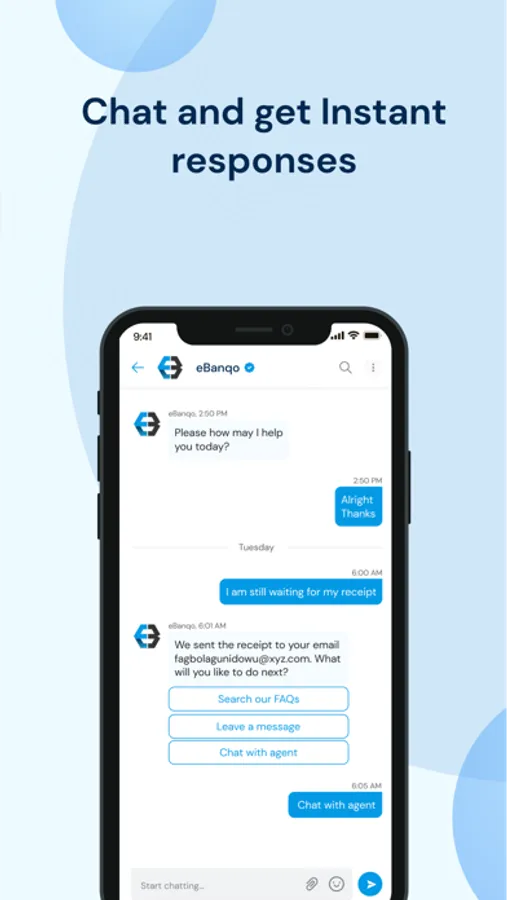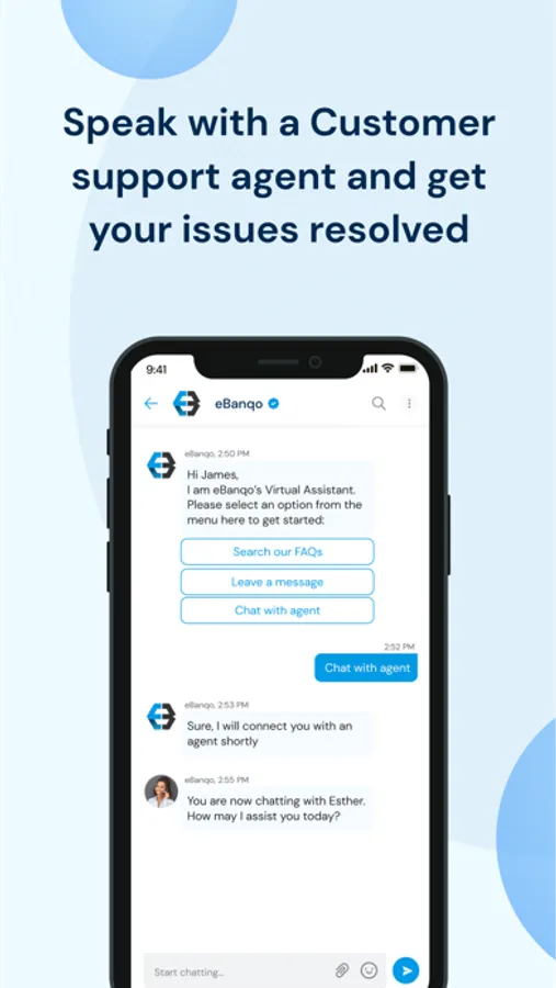 Report service issues real time: Whether you need to escalate a service issue or report a failed transaction, eBanqo Chat enables you to do so instantly and keeps you informed of the resolution's progress.
