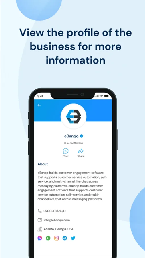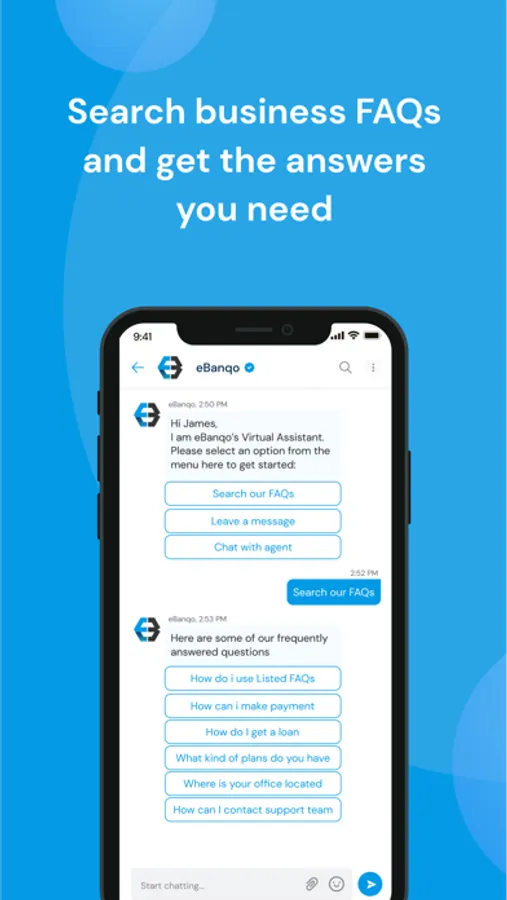 eBanqo Chat is a powerful customer-business engagement platform that streamlines communication and issue resolution between customers and businesses. Designed with a user-friendly interface, eBanqo Chat makes it easy to interact with various types of businesses, particularly those that you engage with frequently. The app is subscription-free, ensuring that all users can take advantage of its benefits. With our app, you can easily ask questions, get answers, perform self-service actions and transactions, report issues, and track their progress as they are resolved, creating a seamless and satisfying customer experience.