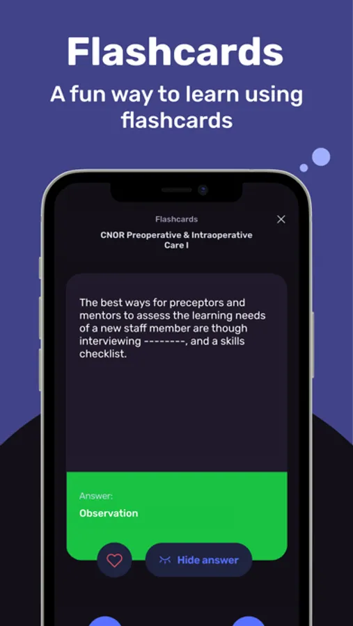 Swipe the cards to quickly review CNOR concepts without the need to go through the whole test, complete the right amount of questions for you, and get some quick studying in.