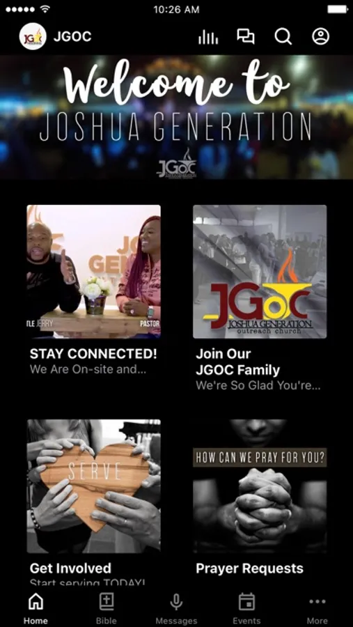 This app will help you stay connected with what's going on at Joshua Generation Outreach Church. With this app you can: watch or listen to past messages; stay up to date with push notifications; share your favorite messages via Twitter, Facebook, or email; and download messages for offline listening.