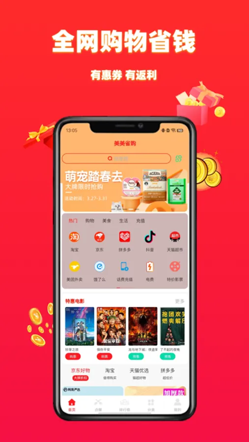通过“美美省购”对接了淘宝、京东、拼多多、抖音等商家购物,可以直接领取购买商品的优惠券,简单省事。下单成功后更有现金返还。