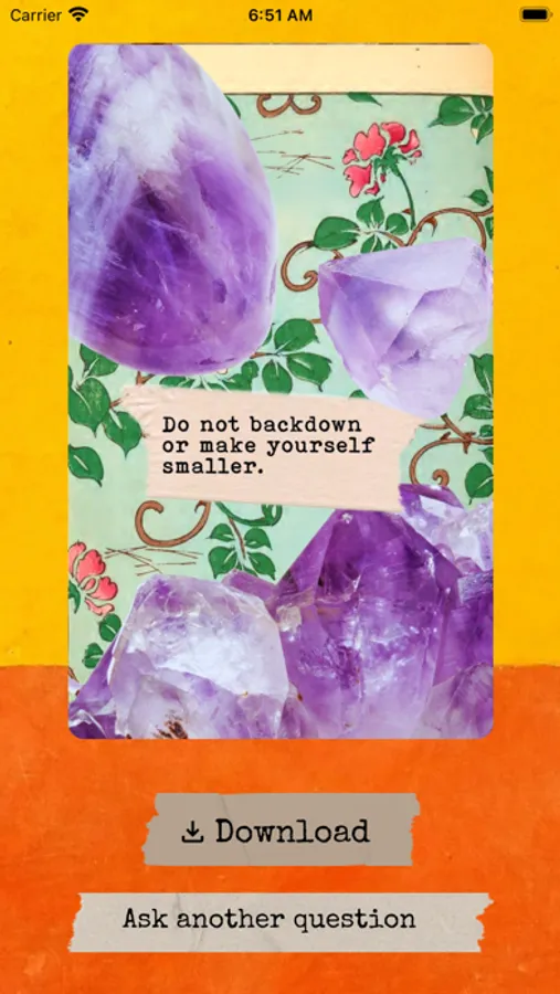 This deck is an online recreation of the popular 'Busy Women Need Answers/Busy People Need Answers' oracle card deck. The app is easy to use. Concentrate on a single question and hit the button to draw a card. Enjoy a brief visual meditation to relax your mind and prepare for your response. Take a minute to look at the card, colors, and objects, along with the words, to gain the most insight. Save and download the card to use as a mobile wallpaper or text to a friend for encouragement.