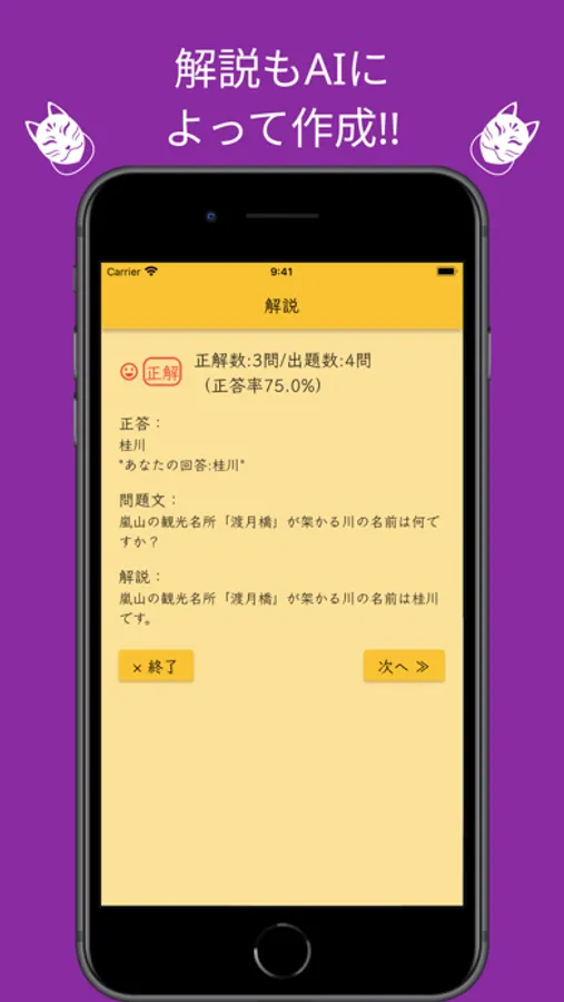 AIによって作成される問題と解説文で、効率的に京都に関する知識を深めることができます。