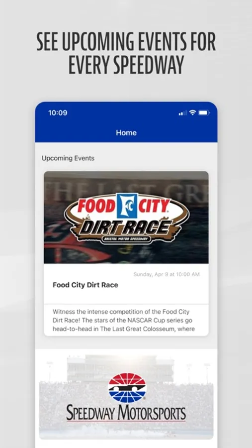 Welcome to the official app of Speedway Motorsports, bringing fans closer to the action and enriching your overall Speedway Motorsports experience. Get all the info you need for each Speedway Motorsports facility, plus exclusive content, and personalized offers and experiences. This is a mobile experience to help you find what you love whether it's event information, special access, or offers and discounts. Powered by Uphoria.