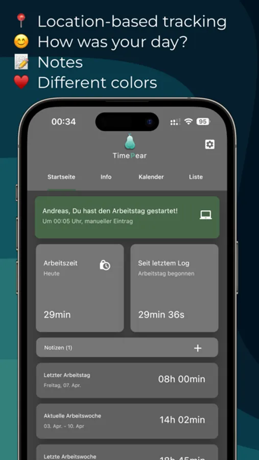 With TimePear, you'll never forget to start or end your day again. The app reminds you automatically when it's time to start or end your workday. The display of when you can end your day (including break time) ensures that you always keep track of your work time.