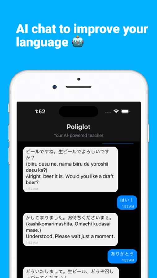 Welcome to our AI-powered Japanese learning app! With our chat feature, you can practice your conversation skills anytime, anywhere. Our app also offers a comprehensive kanji learning system that includes stroke order, meanings, and usage examples to help you master this important aspect of the Japanese language.