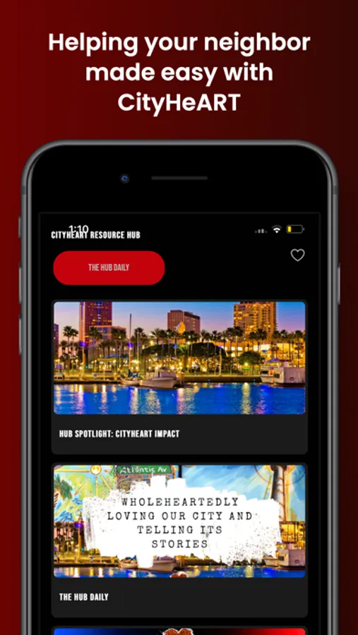 The CityHeART App is designed to put any Long Beach resource you may need in order to help your client, your neighbor, and/or your loved ones in the palm of your hands. CityHeART's mission of wholeheARTedly loving our city and telling its stories comes to life inside this app. Read articles, watch videos, listen to 24/7 CityHeART Radio, and navigate and/or connect to services all in one app.