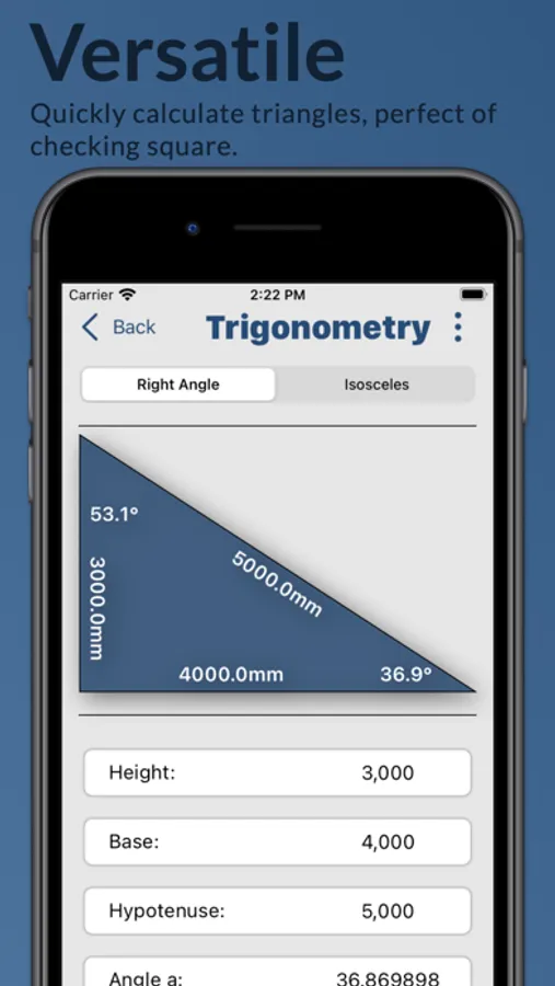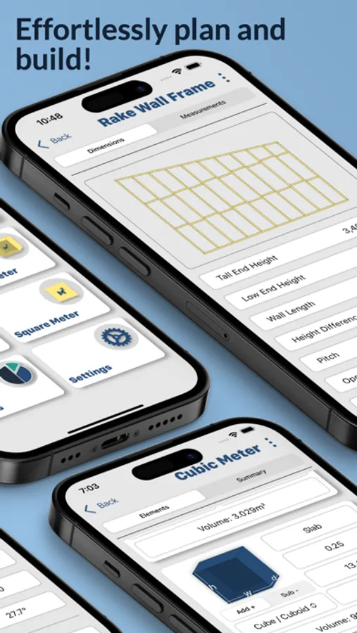 But Buildr isn't just about framing. Our cubic and square meter tally functions enable you to segment large calculations into manageable sizes and shapes, making it easier to plan, budget, and execute your projects. Our trigonometry calculator is a game-changer for right-angle calculations. Whether you're laying out a site, squaring structures, or crafting rafters and braces, this tool ensures impeccable accuracy.