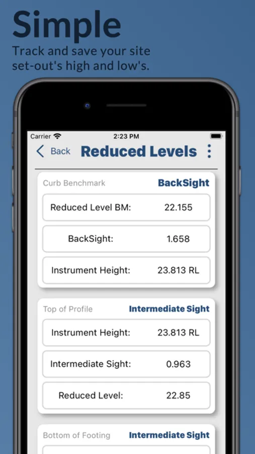 One of Buildr's unique features is our Reduced Level function. This invaluable tool transforms site set-outs, keeping track of your benchmarks, instrument heights, backlights, intermediate sights, and foresights. This level of detail minimises run-out and measurement errors, ensuring a smooth, efficient construction process.