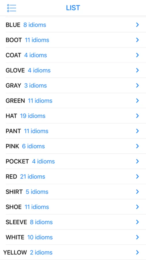 Clothing & Color idioms is a mobile application that provides a collection of commonly used idiomatic expressions related to clothing and color idioms parts in the English language. Users can learn the meanings and usage of these idioms through the app's easy-to-use interface, which includes definitions and examples.