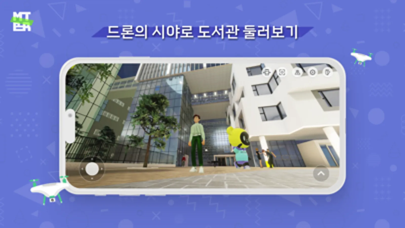 메타로보가 드론을 날려서 도서관 내부와 외부를 구경시켜 줄 거예요.