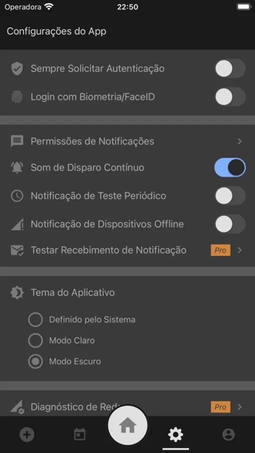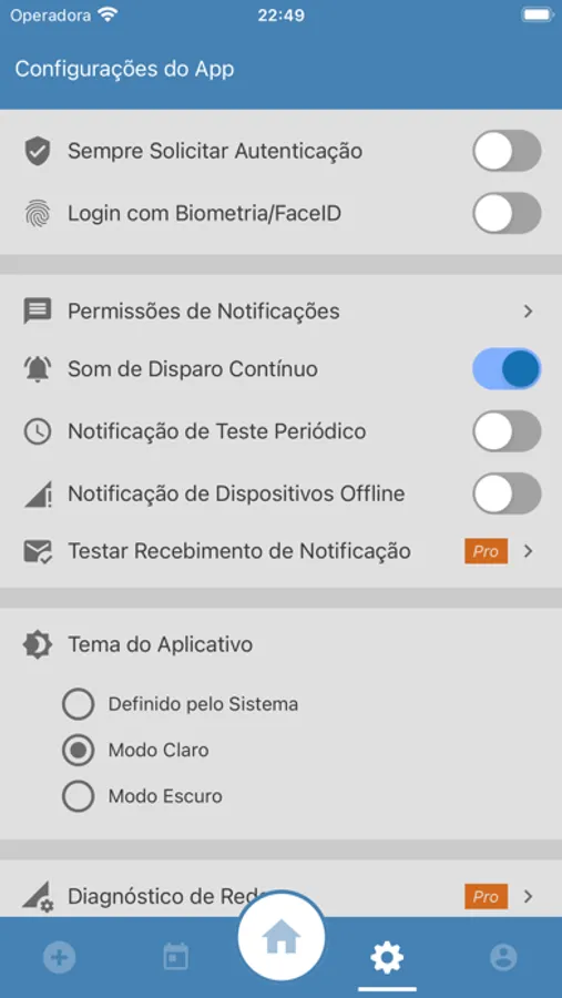 A configuração de tema permite selecionar entre modo claro, escuro ou definido pelo sistema.