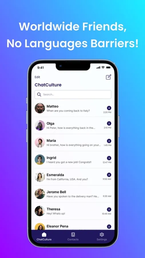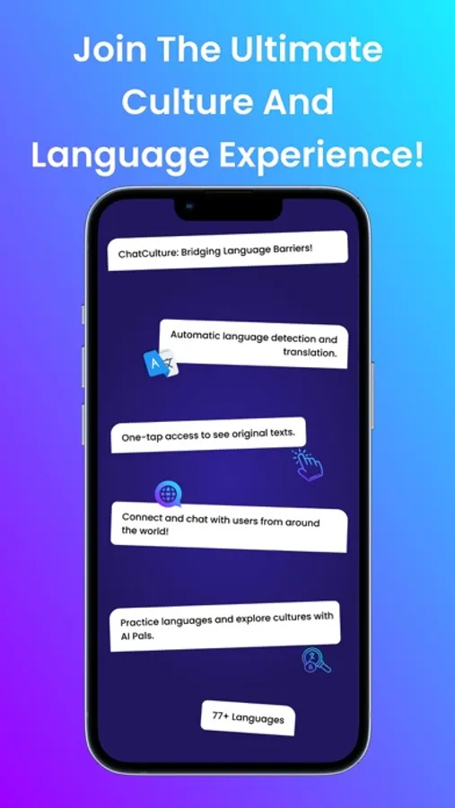 Connect Globally: Chat, send messages, and immerse in conversations across 77+ languages with ChatCulture. Perfect for travelers, learners, or anyone seeking to broaden their global connections. With our real-time translator, every message is understood.