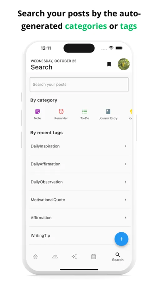 Notes are automatically categorized into journals, reflections, reminders, goals, and more. Search by tag, theme, or tone with ease.