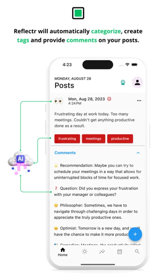 Declutter your mind with Reflectr, an AI powered private Notebook and Journal to manage everything on your mind. You can freely and privately express your thoughts, ideas, and notes just for yourself without the pressure of social media or sharing. Our AI will automatically categorize your posts (i.e. note, journal, to-do, reminder, goal, etc), add tags, and provide comments, summaries and insights for your posts so you can gain clarity, and be more focused and productive.