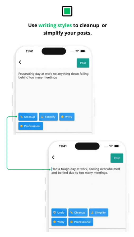 Simply type or voice record your notes/thoughts and use one of the AI-assisted writing styles to tidy up or simplify your posts. Don't fret about grammar, spelling mistakes, or perfect sentence structure – let AI handle it for you.