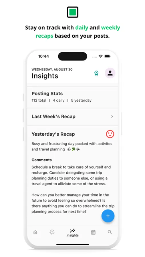 Post every day, and get comments, questions and recommendations from AI after each day and each week, empowering you to channel your energy and focus in the right direction.