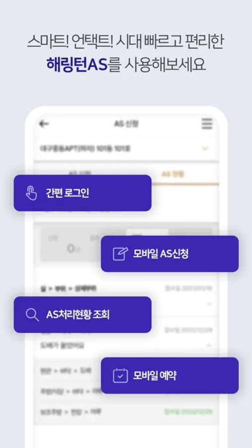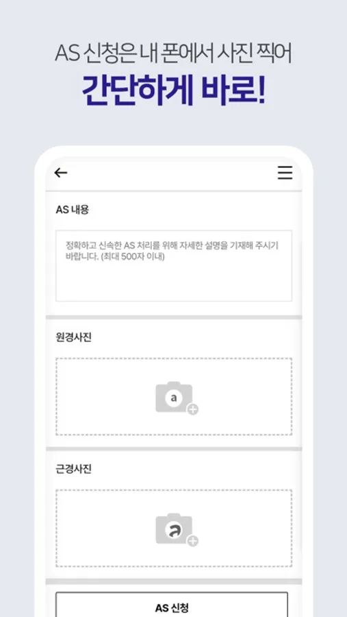 AS처리 업무를 쉽고 빠르고, 투명하게 운용하기 위하여 고객의 스마트폰으로 직접 AS처리 사진과 내용을 등록하고, 관리할 수 있는 서비스를 제공하고 있습니다.
