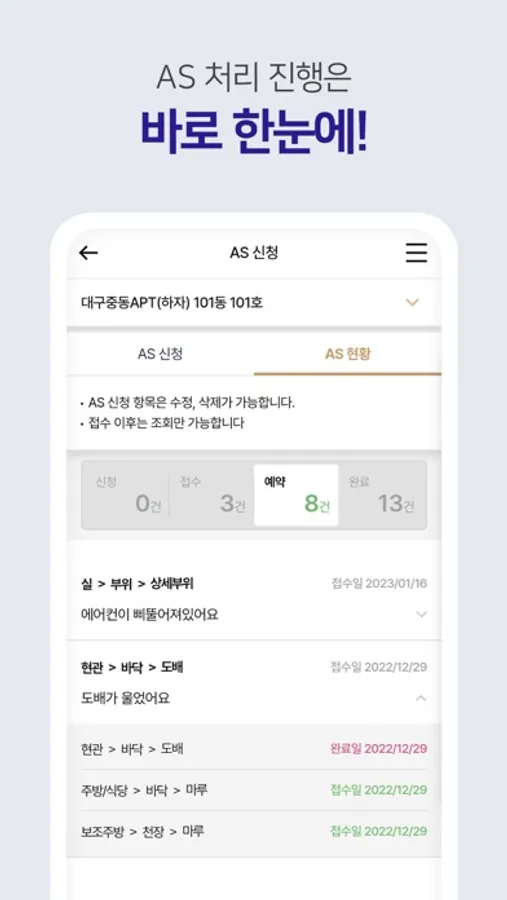 고객이 등록한 다양한 형태의 AS의 처리 과정도 실시간으로 확인 할 수 있습니다.