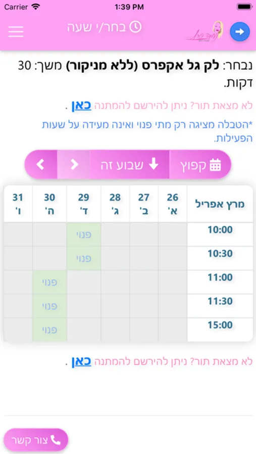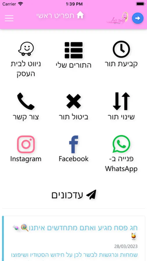 באפליקציה אפשר לקבוע תור, לנווט באמצעות Waze ולפנות אליי באמצעות WhatsApp.