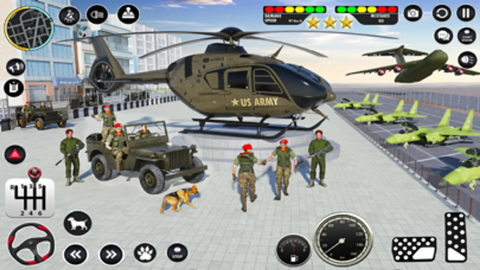 Exciting car driving with patrolling vehicles and escorting trucks to deliver as marked locations of map. Become a top driver of truck and conquer the road with your driving skills and gear up your army vehicles with weapons to launch in to any war. Take down the military cars and fighters jet that try to stop you from delivering army cars in this amazing military transport game. Take any enemy car approaching towards you shooting cars can be taken down in army car shooting game.