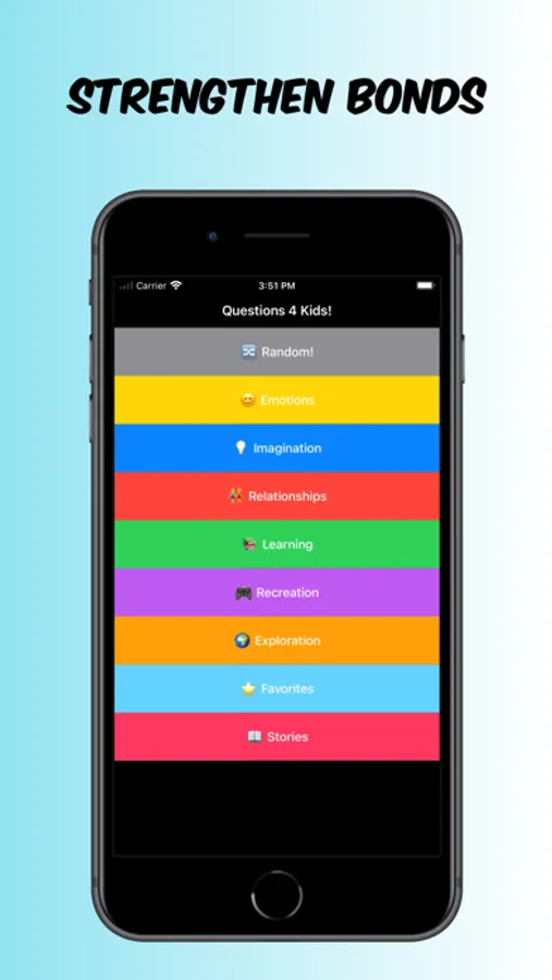 • Over 100 thought-provoking questions spanning 8 diverse categories: Emotions, Imagination, Relationships, Learning, Recreation, Exploration, Favorites, and Stories.