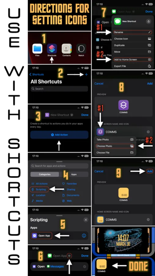 There are detailed instructions in the app to teach you how to use Apple's 'Shortcuts' app to set your creations as icons of your apps, with new names too.