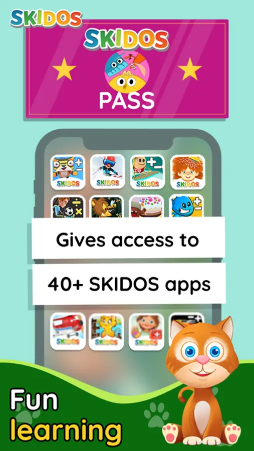 With a single Pass, you access all SKIDOS apps where children of different ages will find games to every taste. You can create up to 6 player profiles within one account and log in from multiple devices. Go ahead and customize the app experience for your kids according to their interests and learning level. Stay on top of how your kids learn - check the progress report in the app or via email.