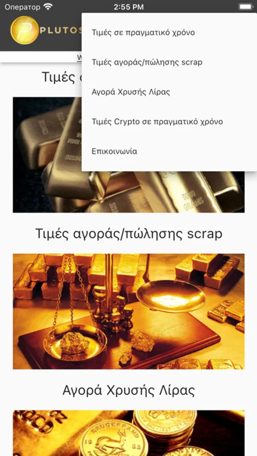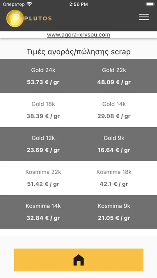 Στην εφαρμογή μας μπορείτε να βρείτε τις τιμές αγοράς και πώλησης, καθώς και τις τρέχουσες τιμές spot market για τα παρακάτω μέταλλα: Χρυσός, Ασήμι, Χρυσή λίρα, Παλλάδιο, Πλατίνα.