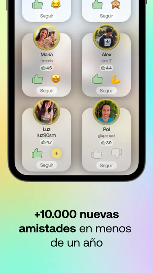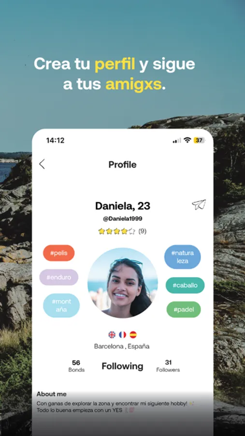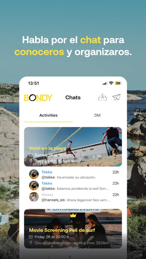 Lo mejor de Bondy sucede fuera de la app y por eso, irás sumando nuevas conexiones reales al asistir a planes, esos serán tus Bonds. Podrás reconocerlos dentro de la app por un borde amarillo en su foto de perfil.