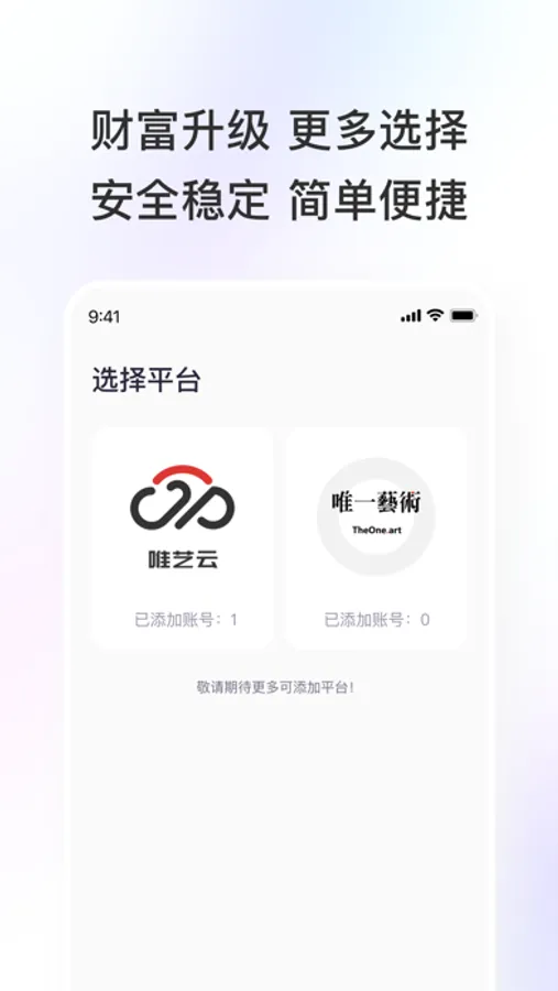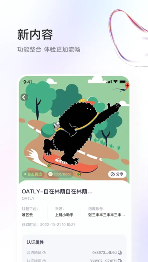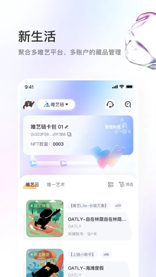 唯艺数字卡包是一款服务于中国Web3生态,多链、多平台下数字藏品管理应用,旨在为用户提供安全、去中心化、易于使用的管理体验。聚合您在唯艺多平台的账户,全流程在线服务,使数字藏品管理更安全、更高效。