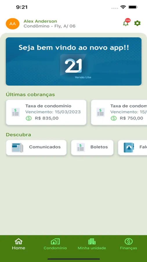 Visualizar cobranças em aberto da sua unidade e obter 2ª via de boletos (com recálculo automático de multas e juros);