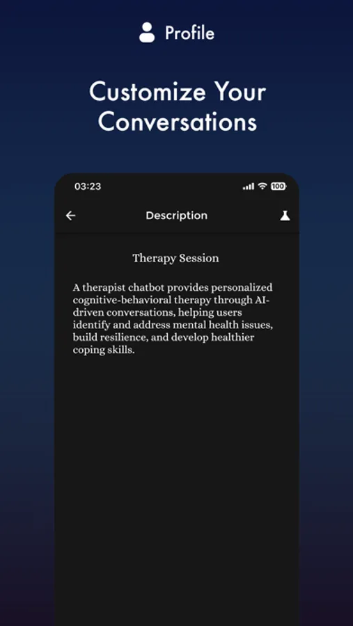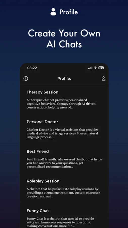Profile uses artificial intelligence to generate appropriate responses to your conversations, making chatting on Profile a truly unique and engaging experience.