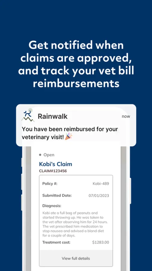 The Rainwalk Pet Insurance mobile app helps support the health and well-being of the pets we protect. We offer generous coverage for accidents and illnesses with valuable benefits like 24/7 virtual vet visits and claims reimbursements in days.