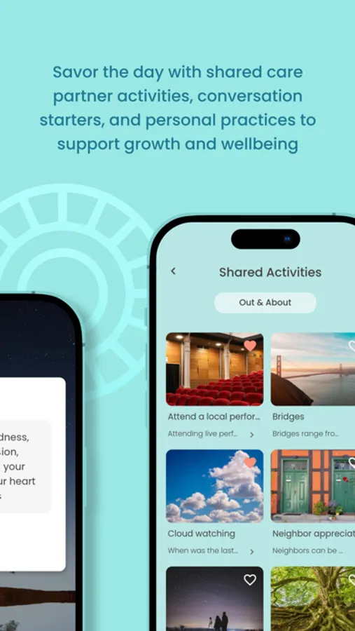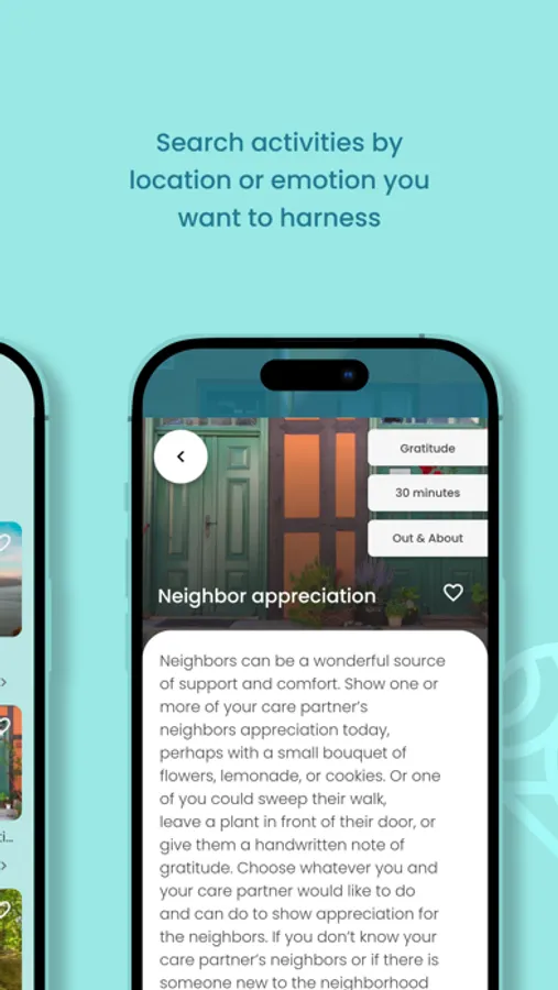 Access a diverse collection of shared activities designed for you and your care partner, revolving around the five core positive emotions – gratitude, empathy, forgiveness, love, and awe. Search activities based on location, time available, or the desired positive emotion you wish to harness. Each activity includes engaging questions to ignite conversation, encourage reminiscence, and strengthen your care partner relationship.
