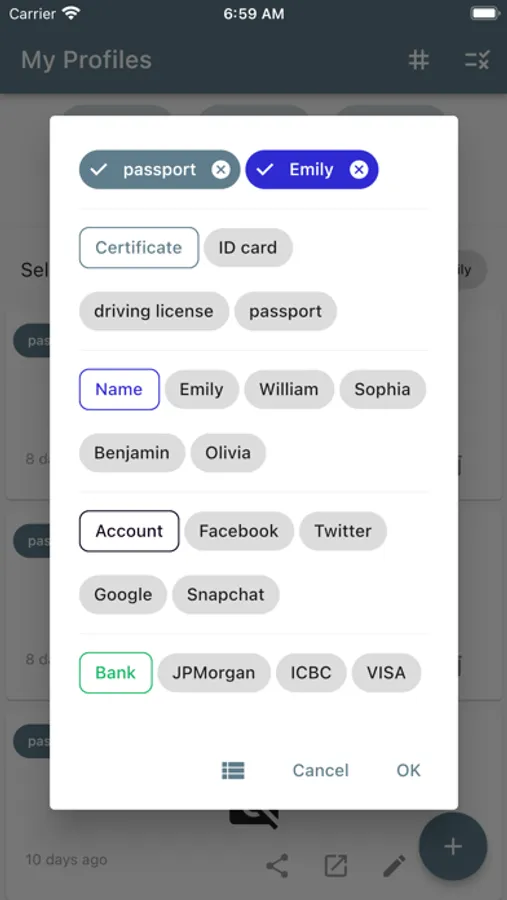 Welcome to Tagging Profile! This is a very practical mobile application that can help you easily manage various important information, such as identification documents, bank card numbers, proof documents, certificates, account passwords, and so on. You can add these pieces of information to the application and use custom tags to label them for quick retrieval.
