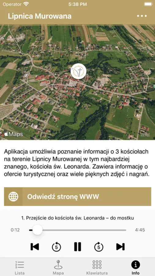Aplikacja umożliwia poznanie informacji o trzech kościołach na terenie Lipnicy Murowanej, w tym najbardziej znanego, kościoła św. Leonarda. Zawiera informacje o ofercie turystycznej oraz wiele pięknych zdjęć i nagrań.