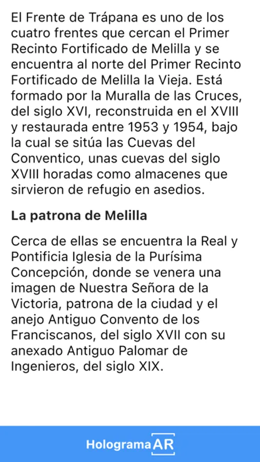 HOLOGUÍA MELILLA es la aplicación turística de la Ciudad Autónoma de Melilla mediante la cual el usuario descubrirá de un modo diferente la Ciudad Vieja y la Melilla modernista: sus monumentos más representativos, su historia, su patrimonio artístico, sus leyendas ... Todo gracias a un guía diferente e innovador: un guía que se te presentará como Hologramas en Realidad Aumentada y que te explicará el lugar en el que te encuentres. Todo lo que necesitas para descubrir Melilla en la palma de tu mano.