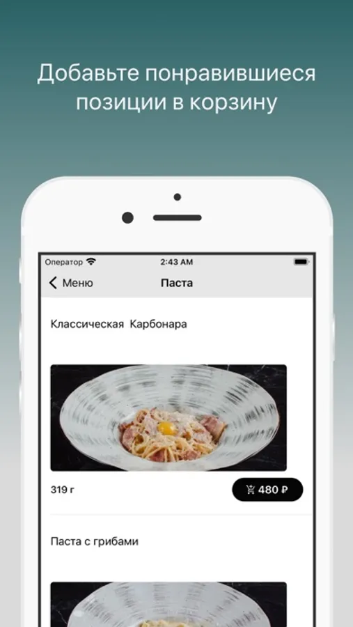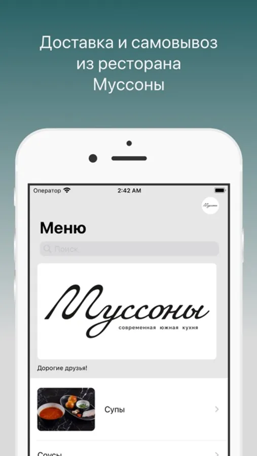 Как сделать заказ в приложении “Муссоны”: выберите понравившиеся позиции из меню, добавьте их в корзину и перейдите на экран оформления заказа (по нажатию на иконку корзины).